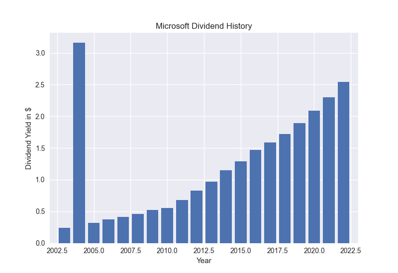 plt.figure()plt.bar(data['Year'],data['Dividends'])plt.ylabel('Dividend Yield in $')plt.xlabel('Year')plt.title('Microsoft Dividend History')plt.xlim(2002,2023) #adjust limitsplt.show()